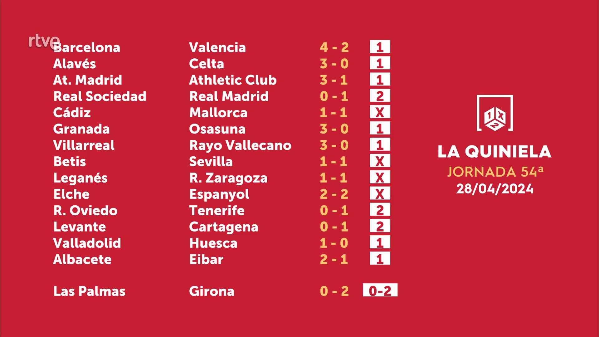 Sorteo de la Quiniela del 30/04/2024 - Jornada 54