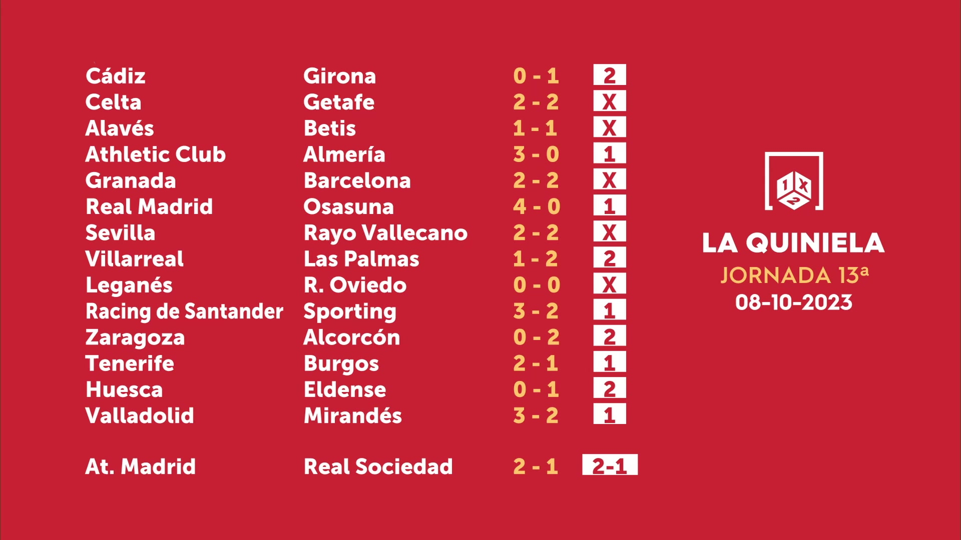 Sorteo de la Quiniela del 09/10/2023 - Jornada 13