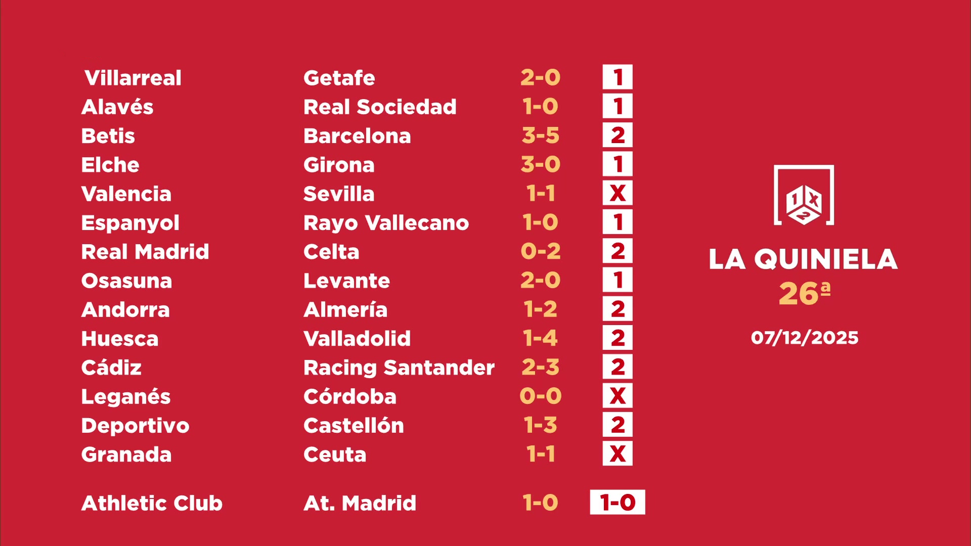 Sorteo de la Quiniela del 09/12/2025 - Jornada 26