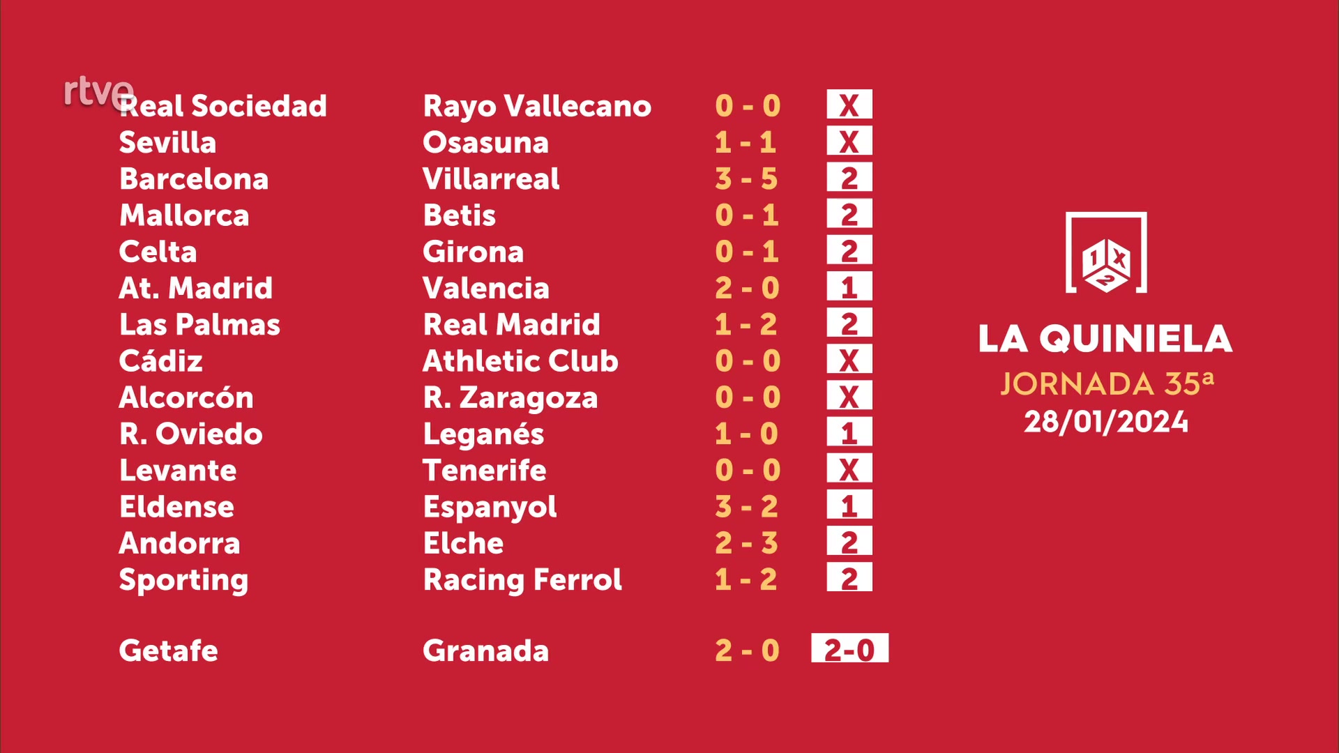 Sorteo de la Quiniela del 30/01/2024 - Jornada 35