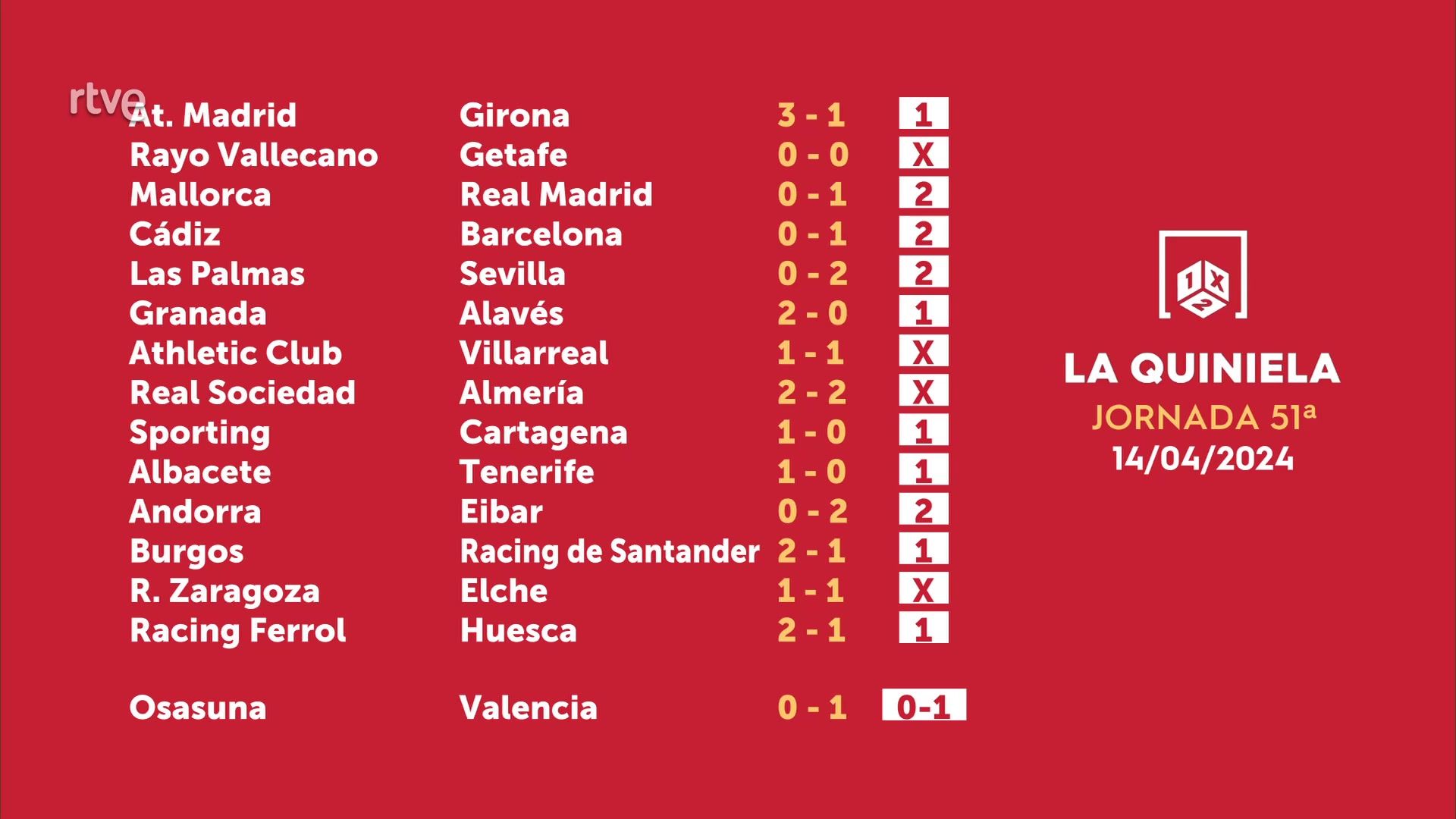 Sorteo de la Quiniela del 16/04/2024 - Jornada 51