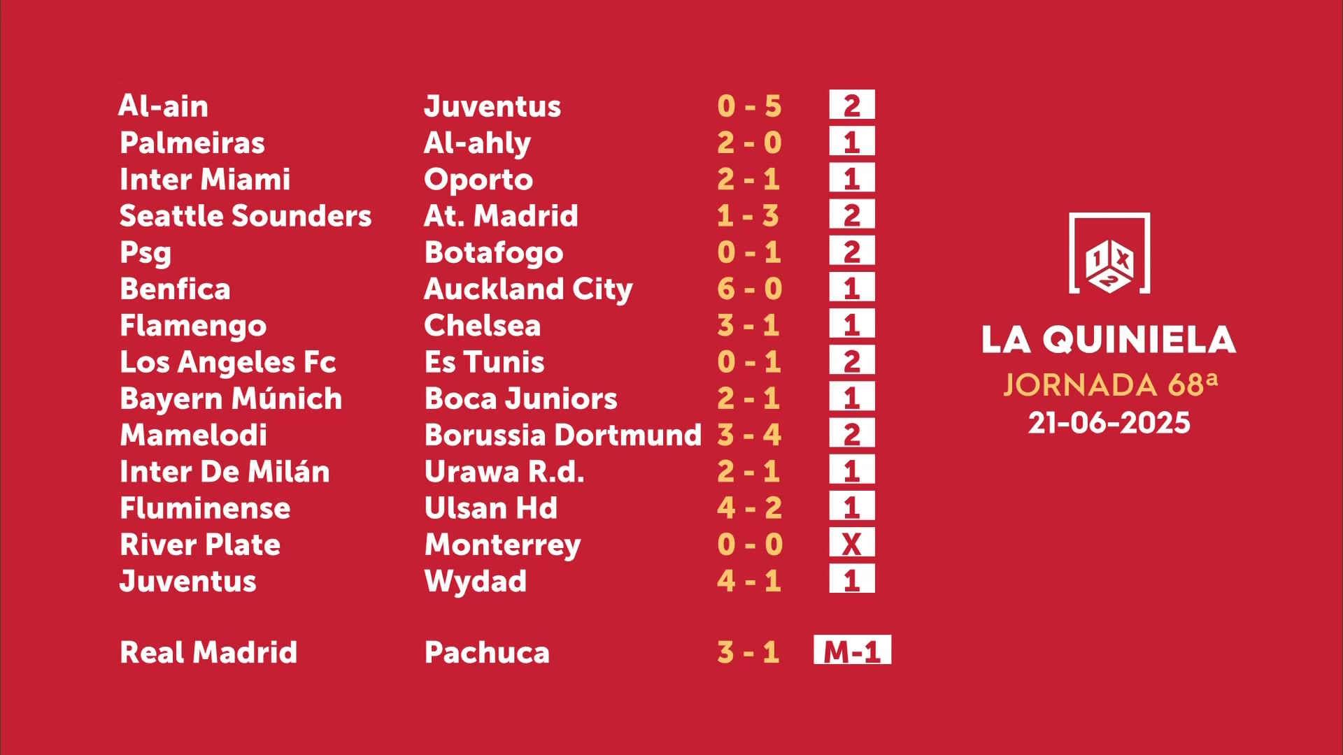 Sorteo de la Quiniela del 23/06/2025 - Jornada 68