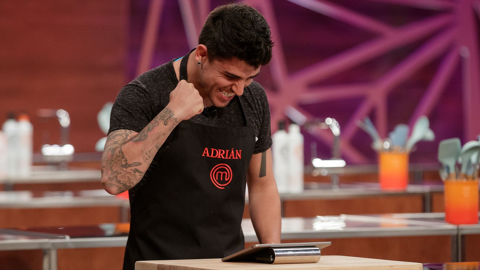 Antes de hacer su entrada en plató, los chefs, a través de una tablet, les dedicaron un mensaje a los aspirantes. Y en el momento en el que Adrián...