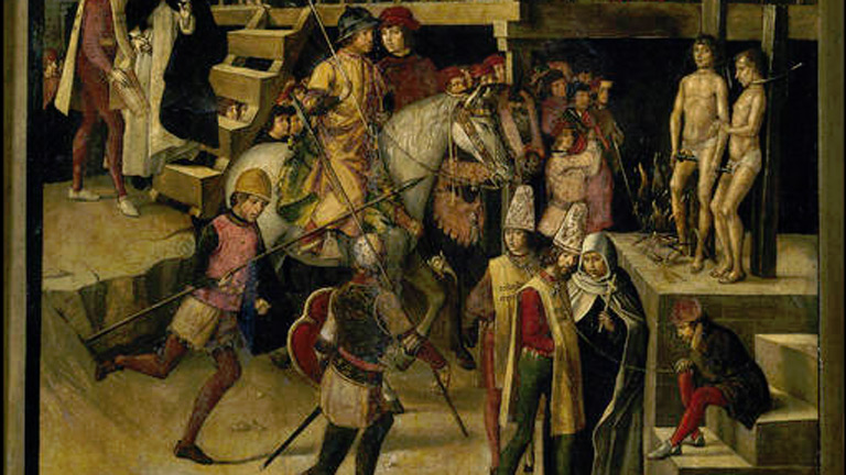 En una tribuna portátil, Santo Domingo, entre otros seis jueces, preside el Auto de Fe en el que se juzga a unos albigenses, según un conocido...