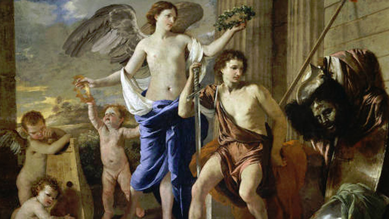 Este lienzo está considerado como una de las obras maestras de la producción de Poussin. En él, se aprecia con claridad la influencia de Tiziano , tanto en la técnica pictórica general como en los modelos formales de los amorcillos. También aparece una de las características más personales del artista: la mezcla de un asunto mitológico, con la Victoria y los putti, y bíblico, en el tema central del rey David.