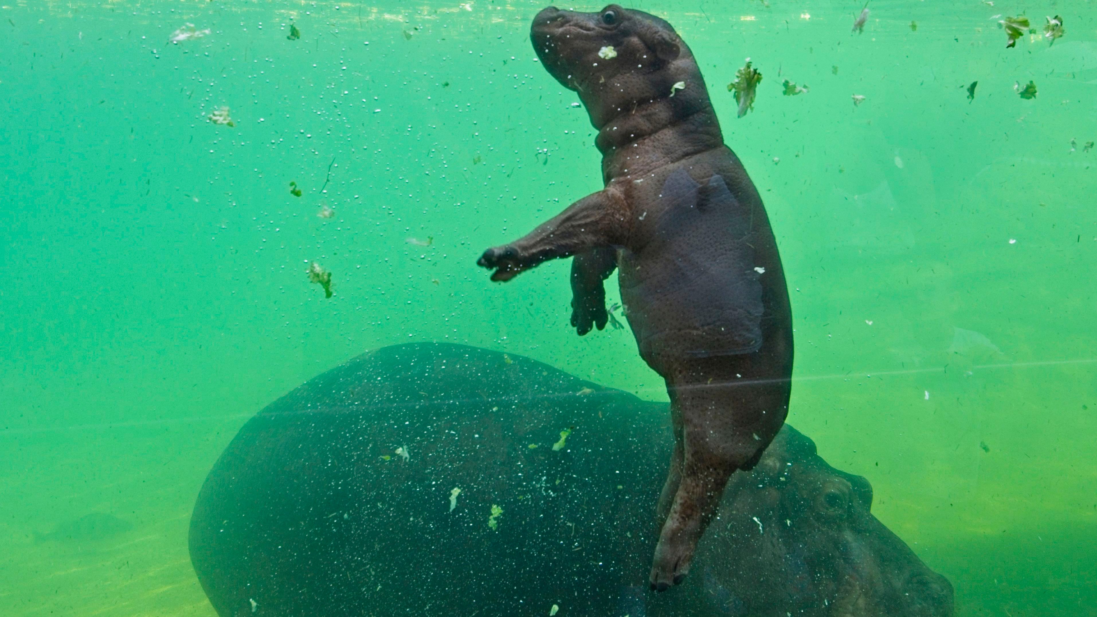 Gloria, una pequeña bebé hipopótamo nacida en Francia hace unas semanas, se zambulle por primera vez en el agua ante la expectante mirada de su...