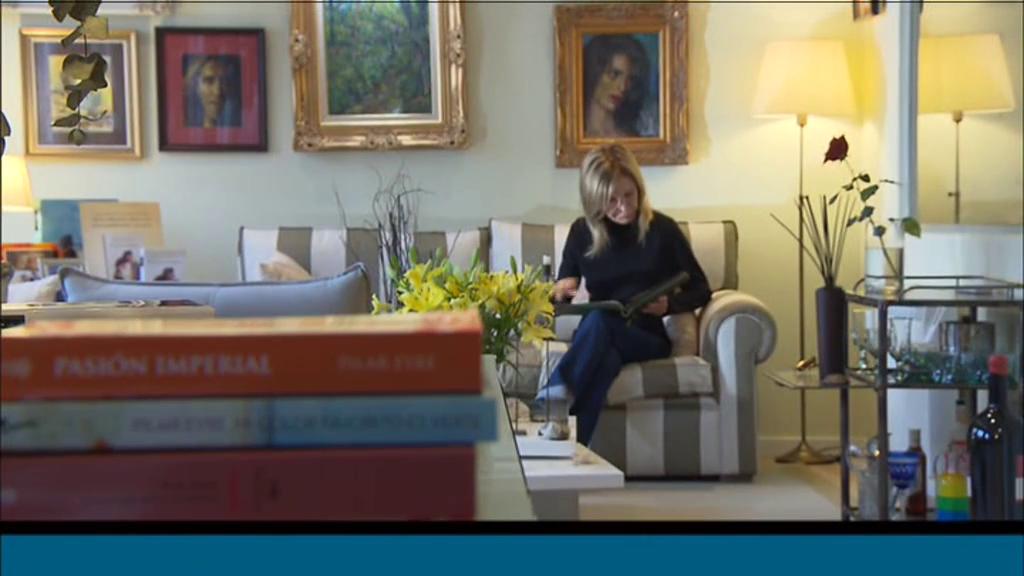 L'escriptora i periodista Pilar Eyre llegint al sofà de casa seva