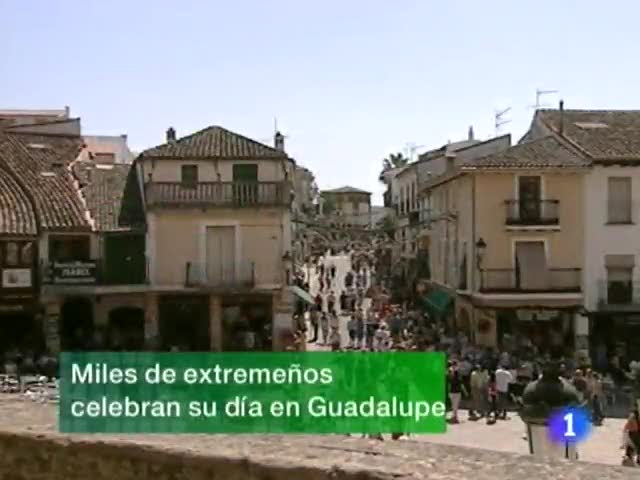 08/09/2009 00:20:20Los extremeños celebran hoy el día su comunidad. Miles de peregrinos, muchos de ellos caminando, acuden a la localidad cacereña de Guadalupe, porque hoy además es el día de la patrona de Extremadura, la Virgen de Guadalupe. "Posible subida de impuestos por justicia social", así de contundente se mostró anoche el presidente de la Junta. La Selección Española ya está en Mérida y a las nueve de la noche celebrará un entrenamiento en el Estadio Romano. TVE en Extremadura cumple hoy 20 años...Fue el Día de Extremadura en 1989 cuando comenzaron las emisiones regulares de informativos y programas del Centro Territorial de TVE en Extremadura... Han sido los primeros 20 años en los que les hemos contado a los extremeños el día a día de la región y hemos proyectado en España y en el mundo el palpitar de nuestra comunidad autónoma. (08/09/09)