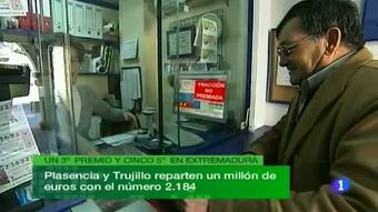 22/12/2011 00:26:14Si hay sitios con suerte hoy en la región esos son Trujillo y Plasencia. Esta administración de la plaza Mayor de Trujillo ha vendido parte del tercer premio y otra parte de un quinto de la lotería de navidad. Así que ha repartido cerca de 600 mil euros. El tercer premio, el 2.184 también ha caído en Plasencia. 500 mil euros la serie. Y también en Plasencia se ha vendido parte de otro quinto. En 4 poblaciones cacereñas se han vendido series de dos quintos premios. Además de en Trujillo, el 3.643 también ha caído en Coria y Guadalupe. El otro quinto premio el 62.718 se ha vendido en Madrigal de la Vera. También se han vendido algunos décimos por terminal de otros 3 quintos premios en Casar de Palomero, Azuaga, Cabeza del Buey, Siruela, Navalvillar de Pela, Salvaleón y Zafra. (22/12/11)