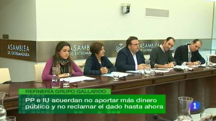 El Partido Popular e Izquierda Unida acuerdan no devolver al Grupo Gallardo el dinero que ha aportado el ejecutivo extremeño al proyecto de refinería en los años anteriores. Ambos partidos han aprobado en la comisión de empleo esta mañana que la Junta no destinará más capital al proyecto, a partir de ahora // Arranca la décima legislatura de la democracia en el Congreso de los Diputados // Culmina la primera fase de la operación especial de tráfico por Navidad con un fallecido en las carreteras extremeñas // Iberocio en Badajoz y trueque de juguetes en Cáceres; propuestas para los niños en estas fechas // En deportes, la directiva del Badajoz busca a un nuevo entrenador, tras la dimisión de Torres Mestre. (27/12/11)