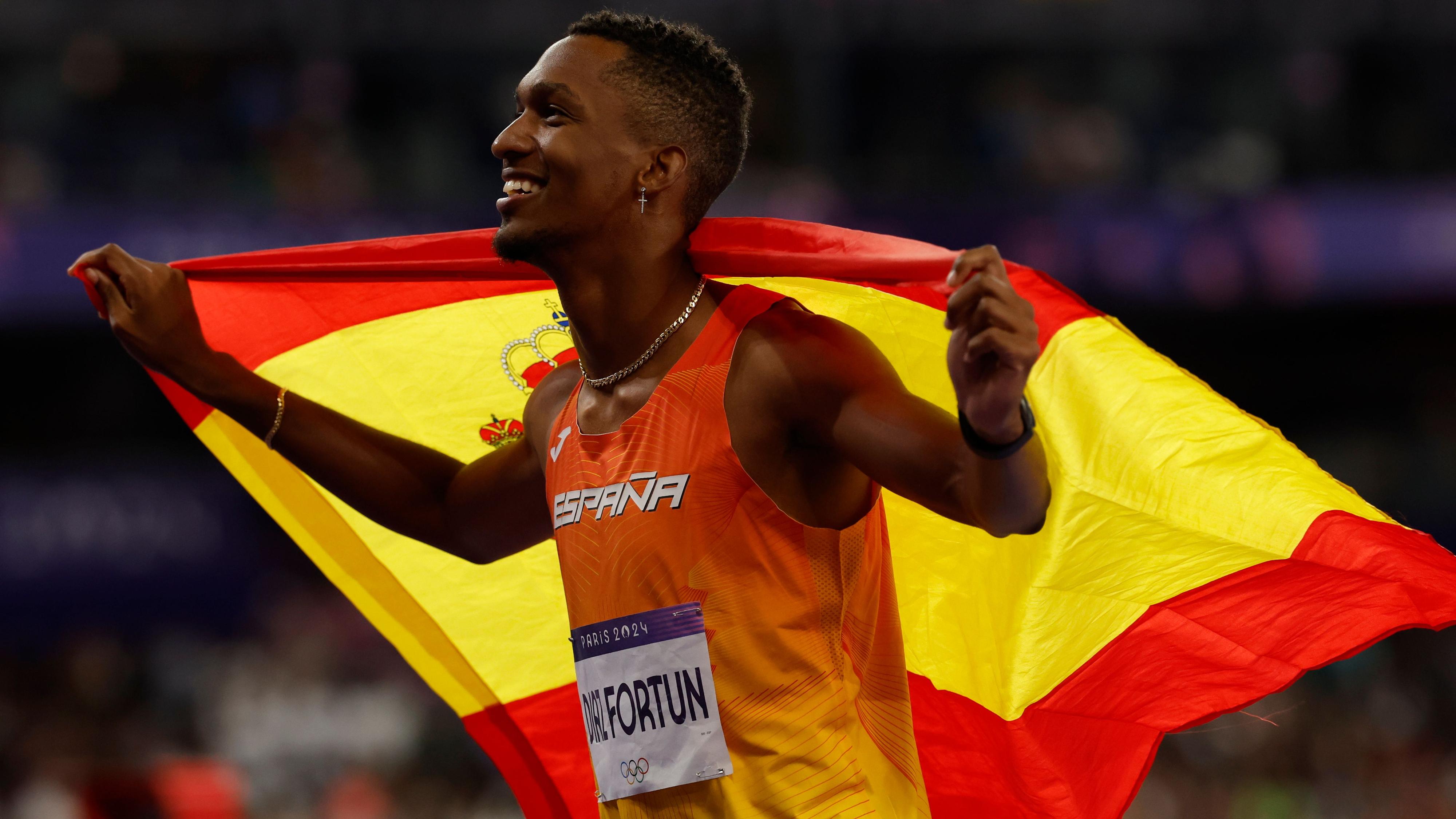 Jordan Díaz celebra el oro en la final de Triple salto masculino en el marco de los Juegos Olímpicos París 2024.