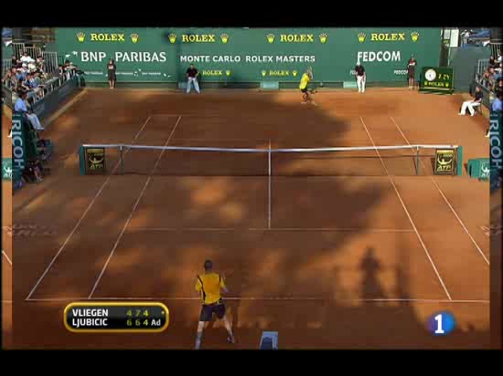 El tenista Vliegen pagó con su raqueta su mal partido ante Ljiubicic en la imagen de la jornada en Montecarlo (14/04/2009).