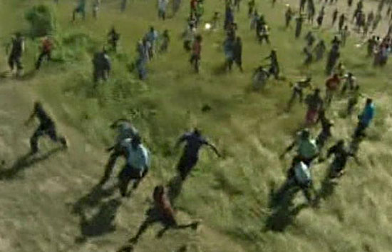 Cientos de personas corren hacia un helicóptero militar en un intento desesperado por recibir algo de comida seis días despúes del terremoto. El...