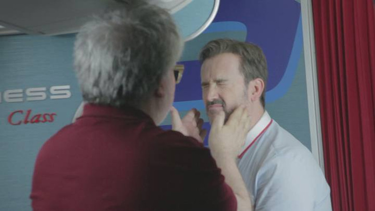 La coreográfia del baile de los tres azafatos. Un momento divertido para Pedro Almodóvar, Javier Cámara y Carlos Areces.
