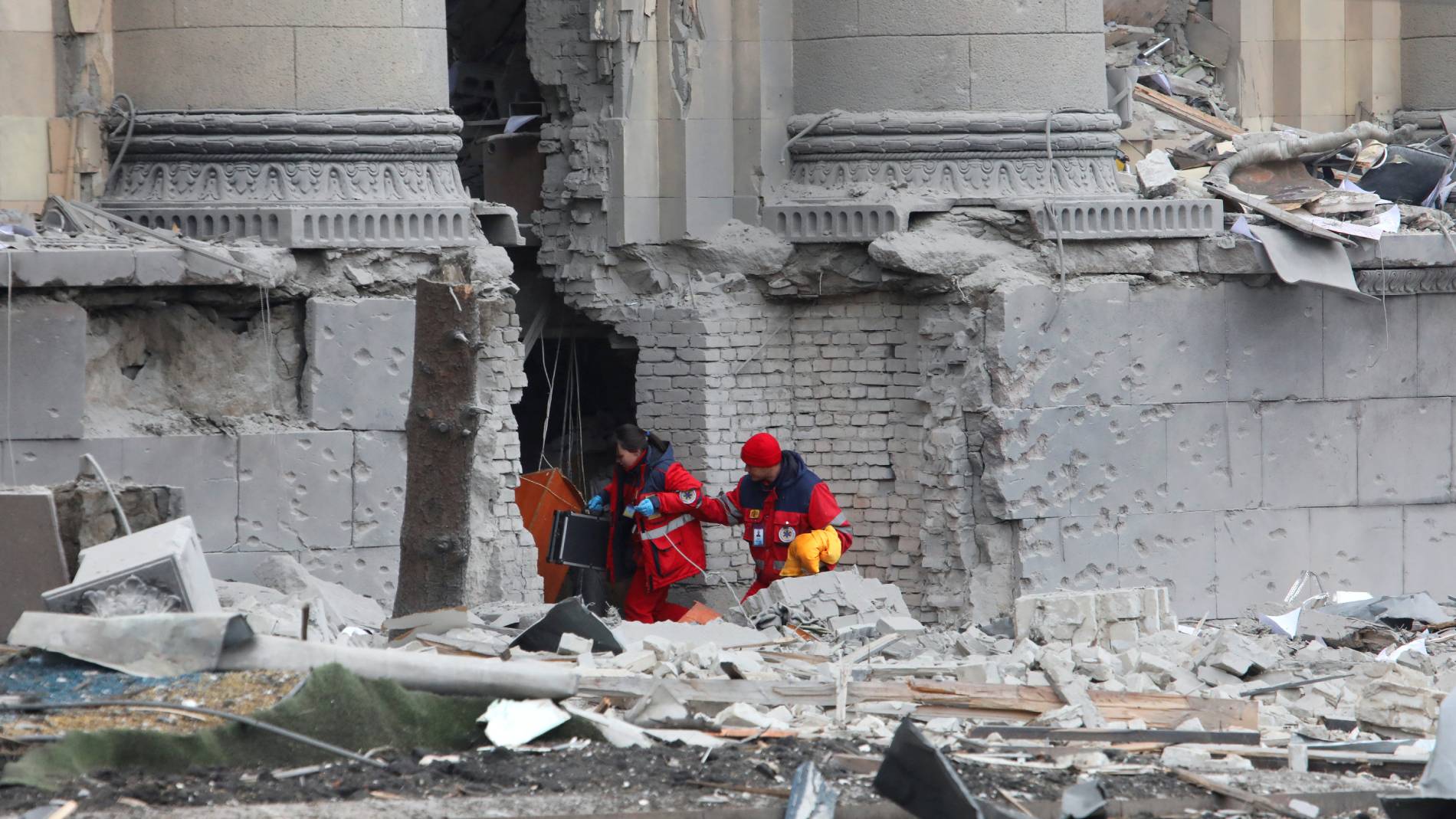 Los equipos de emergencias entran en el edificio del gobierno local atacado en Járkov