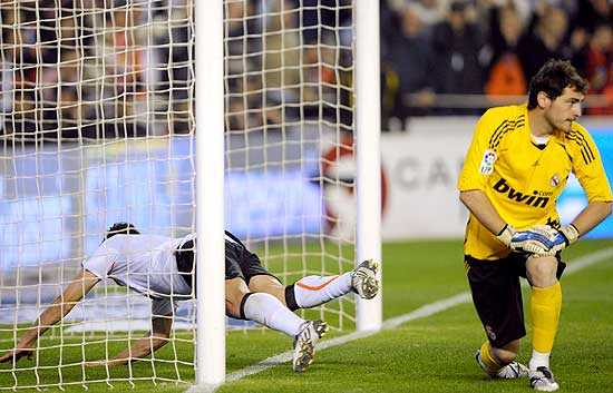 El Real Madrid se ha desfondado en la recta final de la liga y recibe en Mestalla su segunda goleada consecutiva en dos jornadas (10/05/2009).