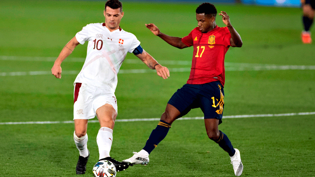 La presión de España sobre Xhaka durante el España 1-0 Suiza
