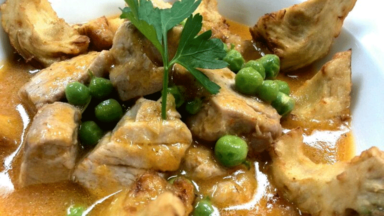 Atún al vermut blanco con alcachofas y guisantes