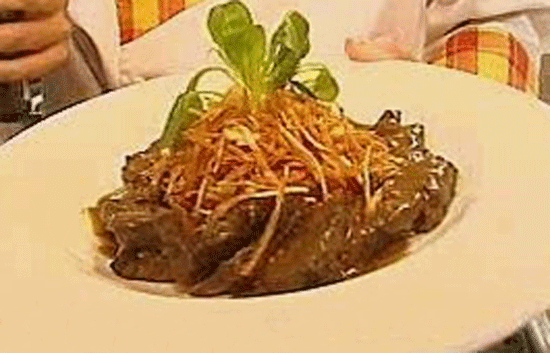 Ingredientes:1'5 kg. carrilleras3 zanahorias1 cebolla100 g. piña1/2 l. agua1/4 l. vino1 rama vainillaAceite de olivaSalRestaurante La Ribera. Gran...