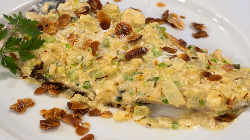 Lubina con salsa de hinojo y azafrán