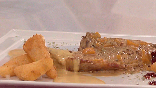 Chuletas de cerdo con salsa de melocotón y queso