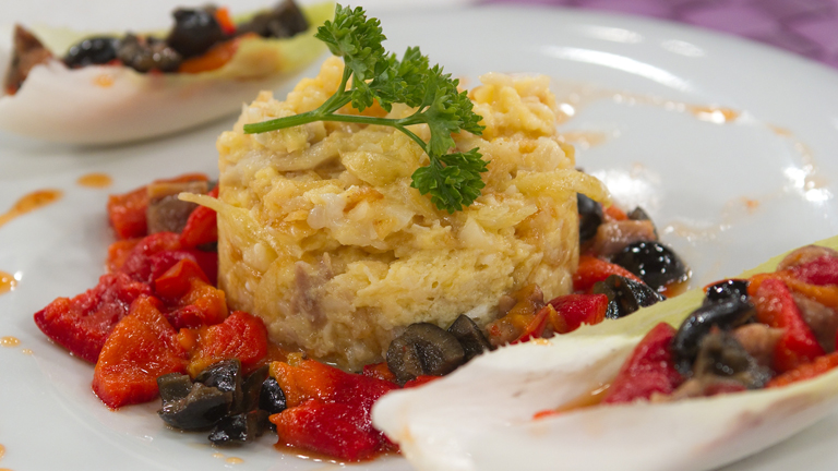 Saber Cocinar - Bacalao dorado con ensalada de pimientos al ajillo