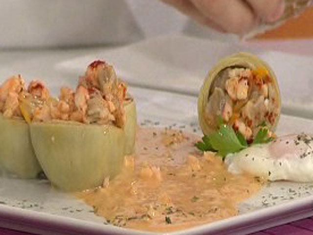 Saber cocinar - Huevos escalfados con corazones de alcachofa rellenos de langostinos (03/02/11)