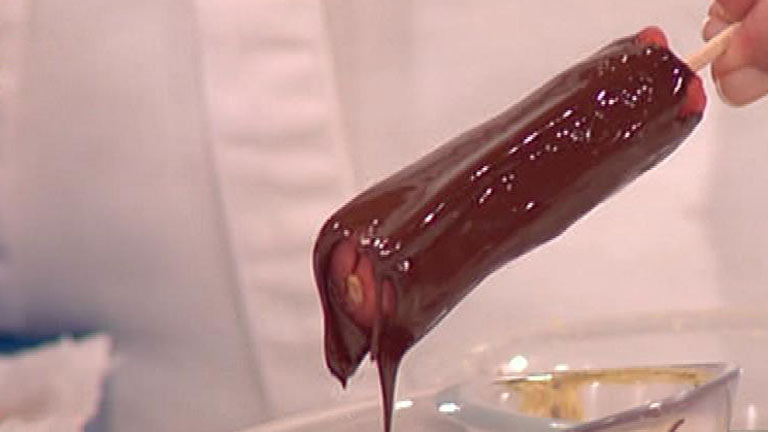 Un postre muy refrescante a base de sandía, chocolate negro, pistachos y chocolate blanco.