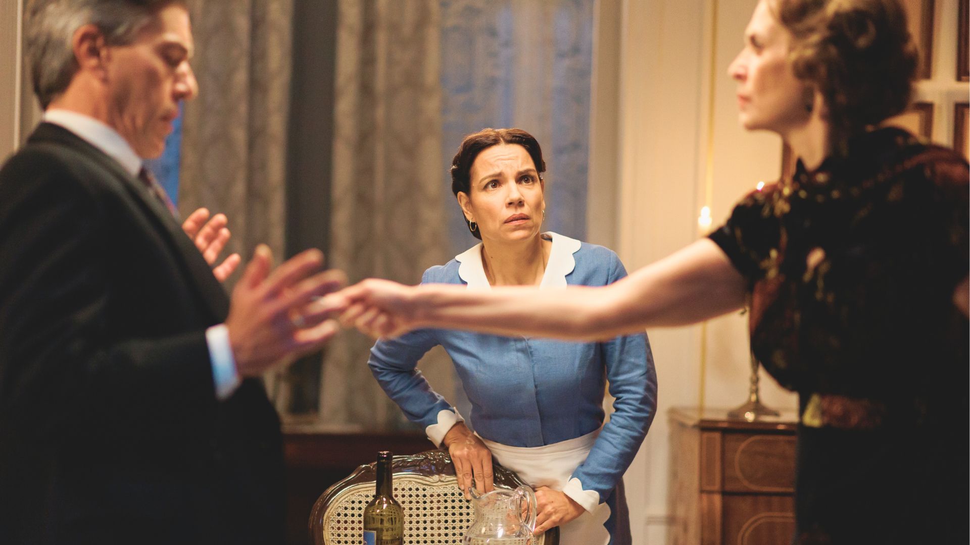 Durante una cena en la mansión Pedraza, Maruja pierde los nervios y acaba amenazando a Emiliano con un cuchillo delante de Pepita.
