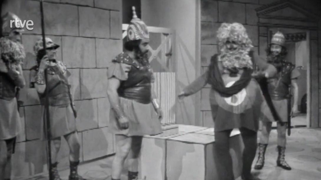 30/05/1971 00:46:34Representación de teatro infantil de la obra de Plauto 'Miles gloriosus', como El soldado fanfarrón. Un militar fanfarrón y vanidoso lleva hacia Éfeso a una muchacha ateniense amante de un joven de su ciudad. Un esclavo de este joven cae prisionero y lo compra el mismo militar. El esclavo hace saber al joven ateniense, por medio de estrategias, dónde se encuentra su amado, y este viene a vivir a la casa de al lado. Además, el esclavo hace un agujero en la pared y así, los enamorados pueden encontrarse. Pero los sorprende otro esclavo, del mismo militar, e inventan una estrategia: dicen que existe una hermana gemela de la amante y le tienden una trampa al soldado, convenciéndole de que abandone a la joven ateniense, porque la esposa de su vecino quiere casarse con él. Al final, sorprendido en casa del vecino, se le castiga por adulterio. Plauto, Autor; Carlos Lucena, director, Juan Manuel Mariño, realizador, Xavier Fàbregas, adaptador literario. Con los intérpretes: Carlos Velat, Joaquin Cardona, Alex Aixelà, Francesc Alborch, Camilo Garcia, Pilar Simon, Nadala Batiste, Maribel Altés, Adolfo Alises, José Aspas y Fernando Rubio.