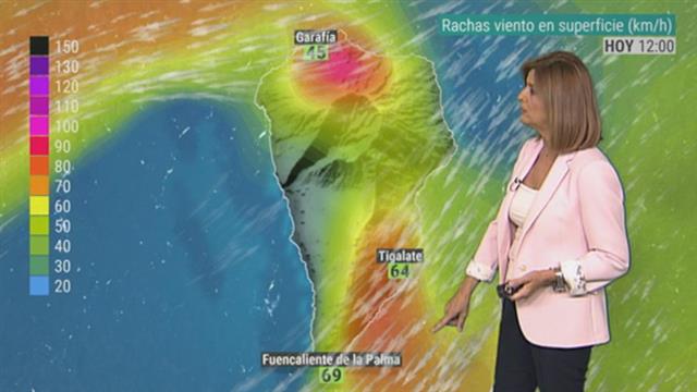 30/09/2021 00:01:03Hoy en Canarias el viento del noreste sigue soplando con rachas fuertes. Si nos centramos en La Palma las rachas más intensas hacia el norte y especialmente al sur de la isla, donde se han rondado los 70 kmh. Siguen soplando los alisios en las próximas horas aunque en superficie se forma al oeste de La Palma una borrasca que va a generar vientos de mar a tierra. A esto unimos polvo en suspensión, calima, que a lo largo de la jornada se va extendiendo de este a oeste afectando sobre todo a la vertiente sur del Archipiélago canario. Una calima que se mantiene durante mañana viernes. Por lo demás hablaremos de cielos parcialmente nubosos en la vertiente norte y lo más destacado, además del viento del noreste, las temperaturas que suben de forma acusada. En Gran Canaria y sur de Tenerife se activa al aviso amarillo por temperaturas elevadas, incluso superiores a los 34ºC de máxima. Podrían marcar 37ºC en el sur de Gran Canaria, 31ºC en Tazacorte, misma temperatura que en Arrecife.
