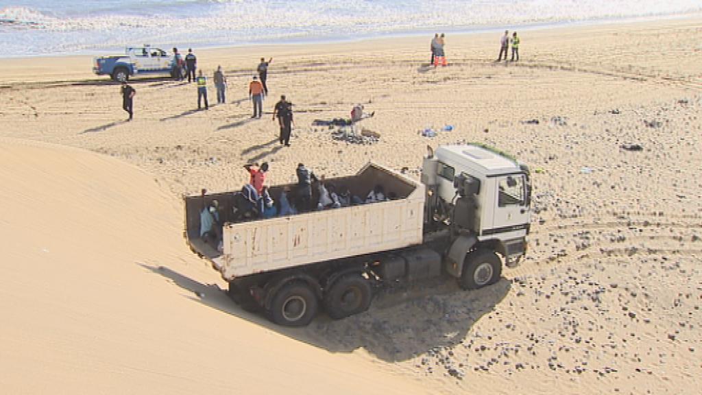 Esta imagen, la de los 21 inmigrantes que llegaron ayer a Gran Canaria, trasladados en un camión de limpieza tras esperar horas en la playa por...
