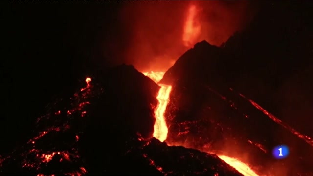 Es el momento del derrumbe de la cara norte del cono del volcán de La Palma. Ocurrió anoche, de madrugada. Ahora la nueva colada discurre en varias...