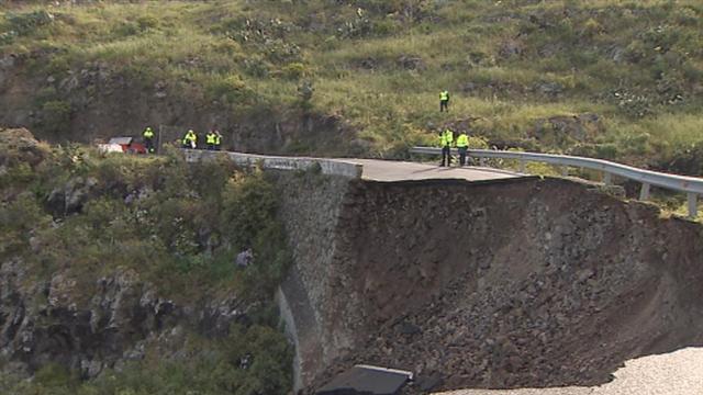 Así está hoy la carretera que une Los Silos con Hoya Pineda, en la localidad grancanaria de Gáldar, tras sufrir anoche un derrumbe que ha dejado...