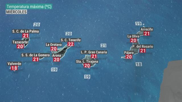 10/02/2021 00:00:53Seguimos con ambiente variable en las Islas Canarias. Van llegando nubes algo más desarrolladas a la vertiente norte donde no se descarta esta tarde alguna precipitación de carácter débil. Vientos flojos a moderados y temperaturas propias de la época. Valores máximos que se mueven entre los 18ºC previstos en Valverde, El Hierro, y los 22ºC de Santa Cruz de Tenerife. En torno a los 21ºC se queda en Las Palmas de Gran Canaria.