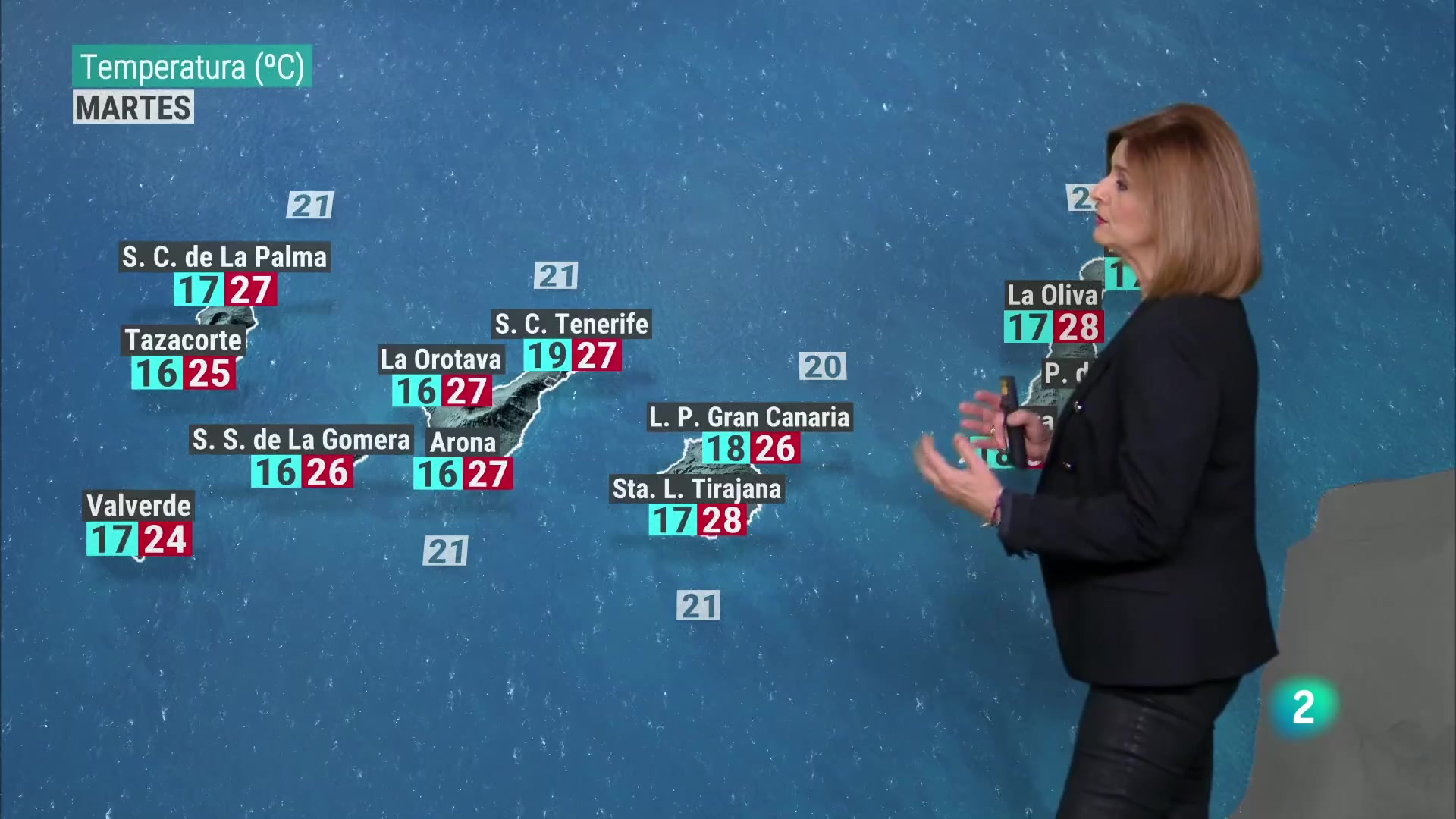 12/02/2024 00:00:53Otra semana de temperaturas suaves en Canarias superando algunos días los 25 grados de máxima. De momento hoy el viento está soplando moderado, con algunas rachas fuertes, superando los 50 kilómetros por hora y en los cielos estabilidad, grandes claros con algunas nubes poco desarrolladas. Mañana hay que destacar la presencia otra vez de Calima, de polvo en suspensión, afectando a las islas orientales. Y es que el anticiclón se vuelve a posicionar al este del archipiélago canario y genera ese flujo de componente este sureste que arrastra todo ese polvo en suspensión, que ya decimos, queda concentrado en Lanzarote, en Fuerteventura. En el resto será un día de estabilidad, sol con algunas nubes altas y temperaturas que tienden a subir, ya veíamos valores máximos en muchas localidades superando los 25 grados.