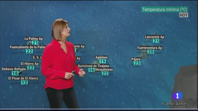 19/10/2023 00:00:55Este jueves ha comenzado con temperaturas algo más bajas. Han descendido las mínimas, el valor más elevado los 23 grados que han marcado los termómetros en Pájara. Sin embargo las máximas hoy están siendo algo más elevadas. En cuanto al estado de los cielos, nos ha dejado algunas precipitaciones que mañana tienden a generalizarse, como pueden ver, la cola de un frente irá desplazándose de oeste a este por el archipiélago canario. El viernes va a ser una jornada de más nubes, especialmente la vertiente Norte, dejando esas lluvias, en general de carácter débil, que se irán moviendo de oeste a este. Tenemos viento del norte moderado aunque a primeras horas, en las cumbres de Tenerife, el viento del noroeste puede soplar con rachas fuertes. Y mañana vuelven a bajar las temperaturas diurnas, nos quedamos de todas formas con 27 grados Las Palmas de Gran Canaria, 25 a mediodía en Santa Cruz de Tenerife.