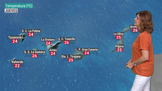 27/06/2019 00:01:01Seguimos con viento del noreste soplando en las Islas Canarias, moderado, con rachas fuertes superiores en la isla de Tenerife, incluso, a los 65 km-hora. Un viento que sigue arrastrando nubes hasta la vertiente norte, van claramente a menos. La tarde se presenta con nubes más rotas en el norte, en la vertiente sur ambiente poco nuboso o despejado. Las temperaturas con ligeras variaciones, valores máximos que se mantienen hoy también mañana entre los 22 ºC y los 26 ºC. La situación sigue dominada por ese viento, por el flujo de norte-noreste que sigue arrastrando nubosidad a lo largo de la jornada de mañana a la vertiente norte de las Islas Canarias. Por la mañana nubes algo más rotas en la vertiente sur con apertura de grandes claros, lo mismo que en Lanzarote y Fuerteventura. Insistimos seguimos con los alisios soplando moderados con alguna racha fuerte y las temperaturas sin apenas variaciones: valores mínimos en torno a los 20-21 ºC, valores máximos entre los 22 y los 26 ºC.