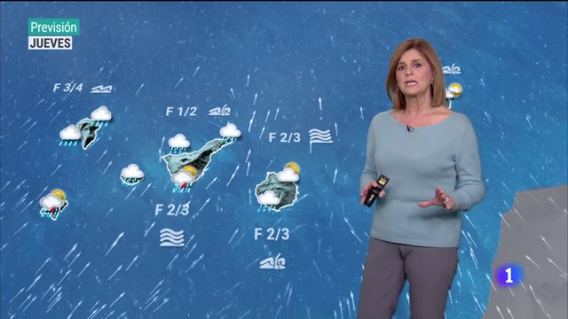 29/11/2023 00:00:54Buenas tardes. Miércoles de transición, a partir de mañana llega la lluvia a las Islas Canarias. Tenemos una borrasca con un frente asociado que como pueden ver a lo largo del día va llegando a las islas occidentales. Mañana barre Canarias de Oeste a Este. Nos va a dejar precipitaciones que a partir de mediodía se inician en la isla de La Palma y en el transcurso de la tarde se irán desplazando hasta llegar incluso al sur de Gran Canaria, pueden caer con intensidad. Está activado el aviso amarillo en la Agencia Estatal de Meteorología por importantes acumulados tanto en una hora como en 12 horas, se pueden llegar a recoger hasta 60 litros por metro cuadrado, acompañados de abundante aparato eléctrico. Las temperaturas podrían ganar algún grado, valores máximos que se mantienen en general entre los 20 y los 25 grados.