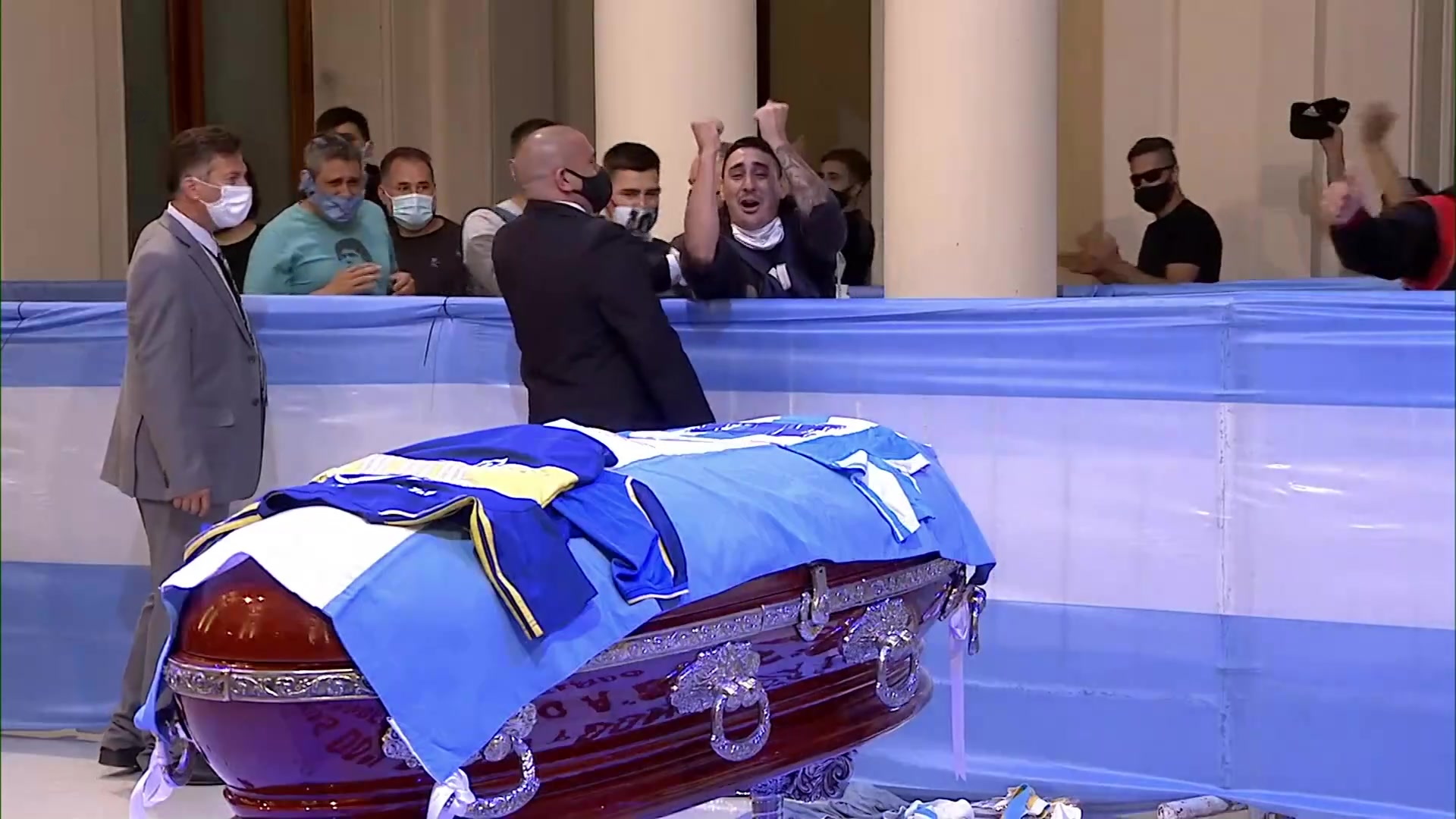 El féretro de Diego Armando Maradona cubierto por la bandera argentina y la camiseta de la selección con el número 10. Desfilando ante él, miles de...