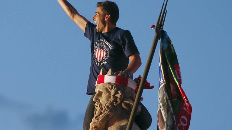 Una multitud de aficionados rojiblancos, congregados en la fuente de Neptuno, de la madrileña Plaza de Cánovas del Castillo, celebró con la...