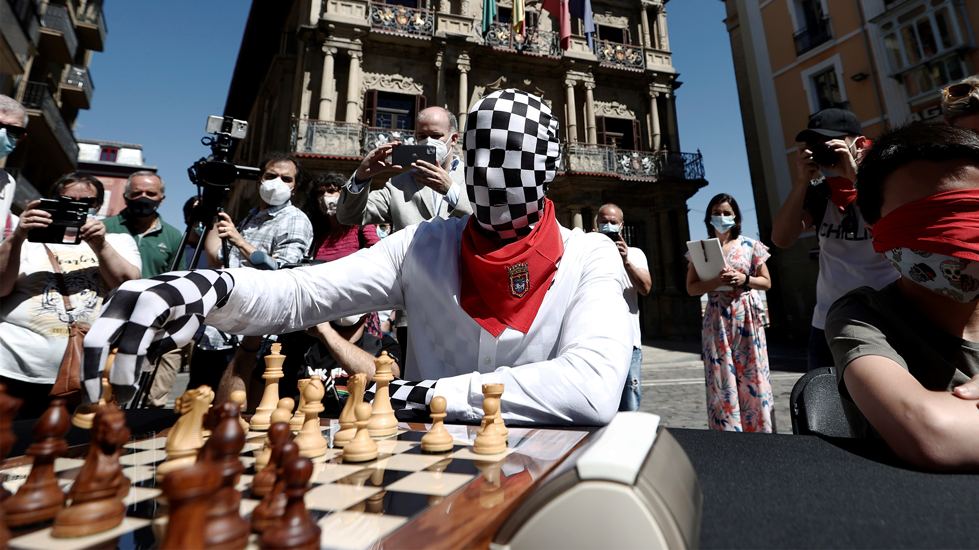 15/07/2021 00:01:17TVE ha hablado en Pamplona con el Rey Enigma, un misterioso maestro del ajedrez que, como un superhéroe, oculta su rostro y su voz verdadera para enseñar su poder: su habilidad en los tableros. Ha participado en un curioso encierro de ajedrez que sustituyó al clásico de los Miuras, suspendido por la pandemia. La partida ha acabado en 20 segundos, con él como vencedor, y es que en muy pocas ocasiones ha perdido una partida cuando le retan por la calle. Tiene menos de cuarenta años, está soltero, trabaja en el sector de la publicidad y está obsesionado con el anonimato. Pero mantener el personaje le está costando muchos sacrificios. En las redes tiene mucha presencia: casi 300.000 seguidores en TikTok y más de 25.000 en YouTube. En un futuro quiere dejar la publicidad y dedicarse en exclusiva al ajedrez, su verdadera pasión, la que empezó a gestarse cuando tenía 5 años mientras jugaba con su abuelo. Foto: Jesús Diges / EFE.