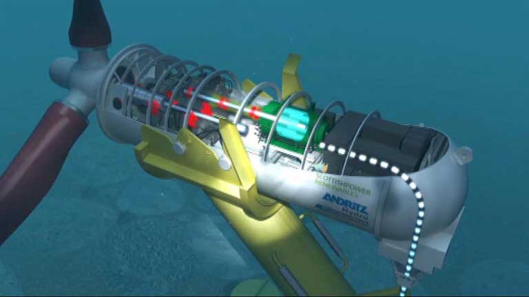 16/05/2012 00:01:26Uno de los estrechos que se forman en el archipiélago de las Orcadas al norte de Escocia, bajo estas aguas se forman algunas de las corrientes submarinas más fuertes del mundo y ésa es la razón por la que se hacen aquí esas pruebas con esta turbina" Las diferencias de niveles de marea genera una corriente que puede tener una intensidad que puede tener entre 1 y 4 metros por segundo. El flujo que atraviesa el rotor del dispositivo Hammerfest produce un movimiento rotatorio que mueve un generador que se encuentra incluido en el anasel y genera una electricidad que se evacúa através de un cable submarino a la subestación terrestre. El cable llega a la costa a través de esta playa y de forma subterránea alcanza la subestación".