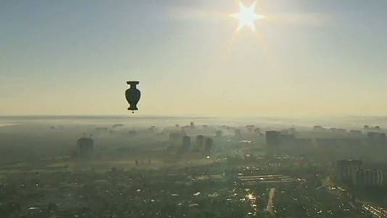 A pocos días del inicio de la Eurocopa de Polonia y Ucrania un globo aerostático, con la forma del trofeo del ganador, ha recorrido el cielo de...