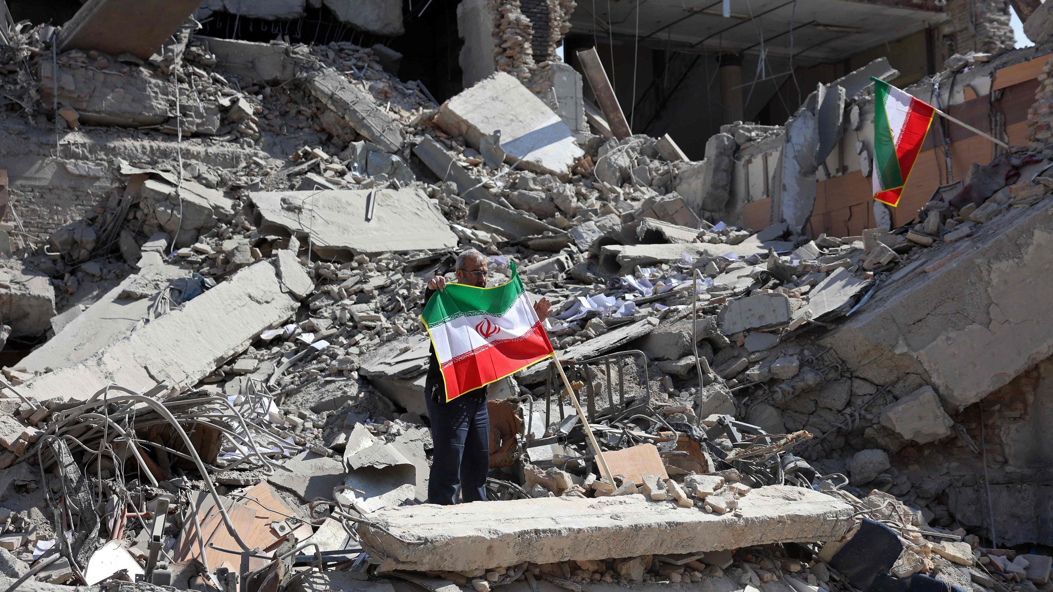 Un hombre con la bandera iraní entre lo escombros de un edificio destruido en Teherán