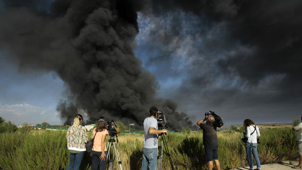 Un incendio en una planta de reciclaje de productos químicos sin licencia en Chiloeches, en la provincia de Guadalajara, ha provocado este viernes una gran columna de humo tóxico visible incluso desde varios municipios madrileños del Corredor del Henares. La nave de disolventes, pinturas y aceites que está ardiendo desde poco antes de las cinco de la madrugada había sido clausurada por el Ayuntamiento el pasado mes de junio y tampoco tenía autorización después de que la Junta de Castilla-La Mancha se la hubiera suspendido de forma temporal y hubiera puesto la situación en conocimiento de la Fiscalía. Ente nuevo fuego en unas instalaciones destinadas al reciclaje de residuos ocurre apenas tres meses después de que ardiera el vertedero ilegal de neumáticos de Seseña, en Toledo, el pasado mes de mayo.