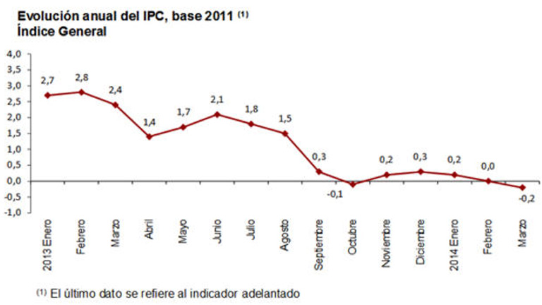 28/03/2014 00:00:28El índice de precios de consumo (IPC) volvió a registrar tasas negativas en marzo al caer dos décimas hasta el 0,2% -después de tres meses positivos y uno plano, el 0% de febrero-, según el indicador adelantado publicado por el Instituto Nacional de Estadística (INE). El INE destaca que en este descenso influyó la bajada de los precios de los alimentos y bebidas no alcohólicas, así como los precios del viaje organizado, que subieron más en 2013 por la Semana Santa. El IPC interanual vuelve a entrar en negativo, como ya hizo el pasado mes de octubre, cuando, por primera vez en cuatro años, marcó una tasa negativa, también del -0,1%. Sin embargo, en noviembre retornó a signo positivo, con un 0,2%, descartándose desde el Gobierno la deflación que requiere una caída generalizada de precios durante un periodo prolongado de tiempo.