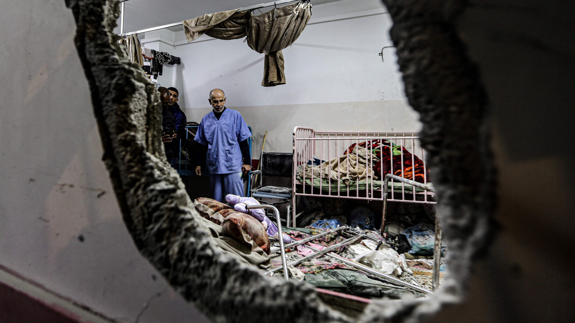 18/12/2023 00:01:32Hospital Nasser en Jan Yunis, al sur de la Franja de Gaza. Un proyectil acaba de impactar en las zonas de maternidad y pediatría. El miedo y la confusión se adueñan de cientos de personas que tratan de huir para ponerse a salvo.