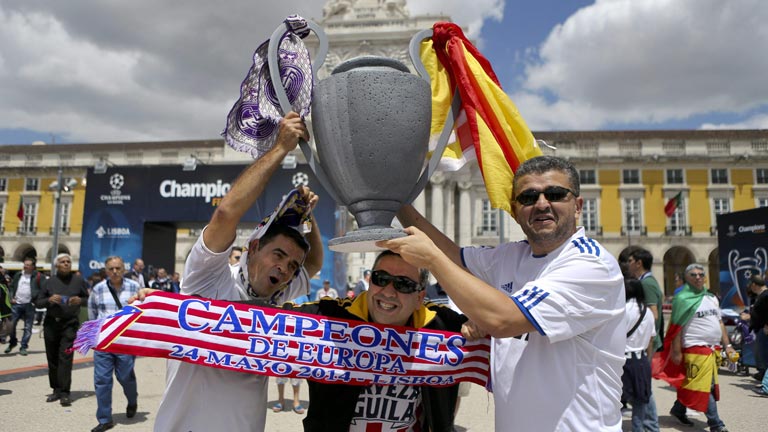 Los aficionados del Real Madrid y del Atlético llenan sus respectivas zonas de acogida en Lisboa, por las que se han dejado ver personajes como Raúl González Blanco, que ha caldeado los ánimos de los aficionados madridistas, o el presidente del Atlético de madrid, Enrique Cerezo, que ha hecho lo propio con los suyos. (24/05/14)
