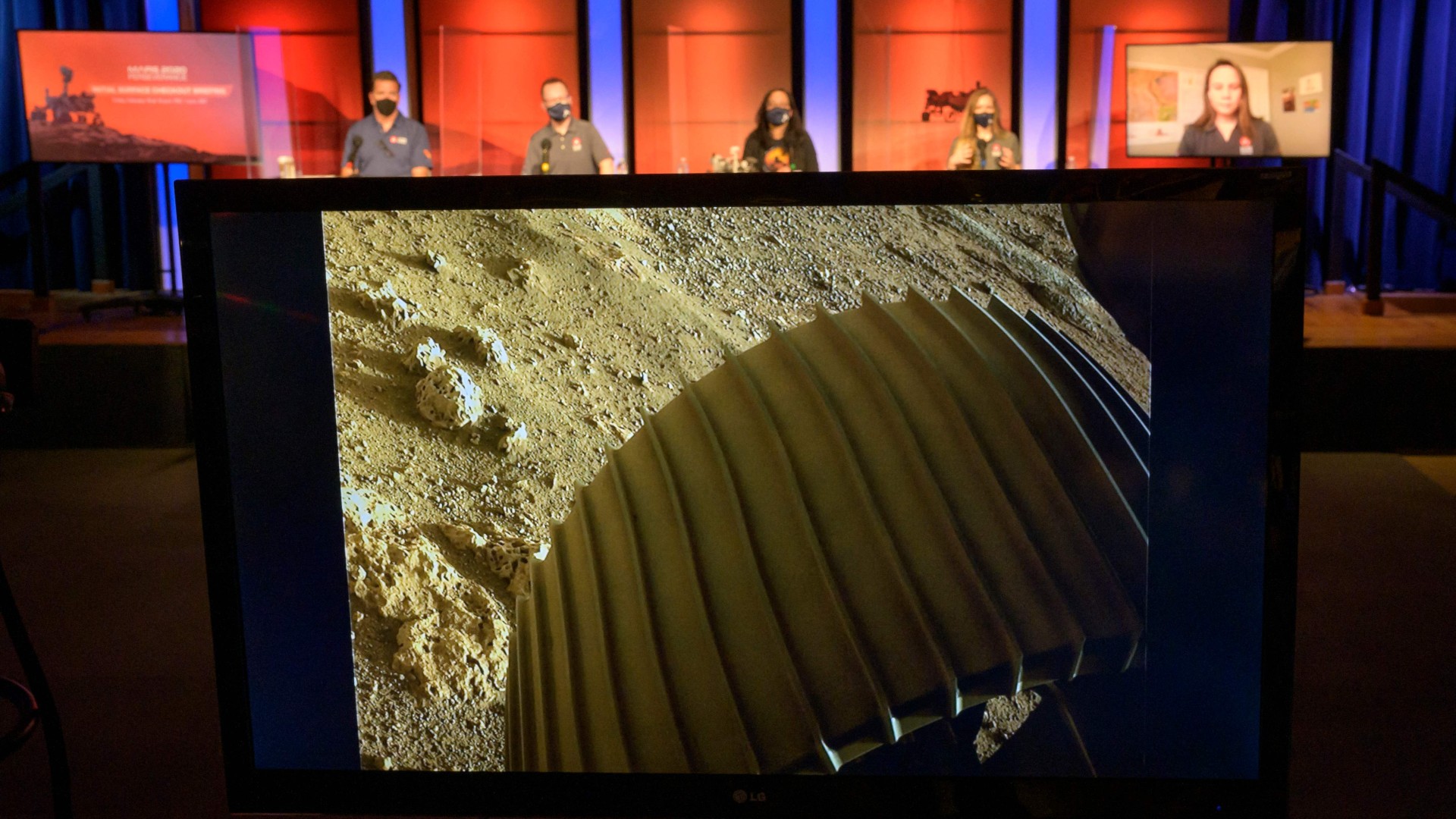 20/02/2021 00:01:17Esta imagen de la NASA en la que se muestra una imagen de alta resolución de una de las seis ruedas a bordo del vehículo Perseverance Mars de la NASA, tal como se mostró durante una sesión informativa inicial de verificación de superficie del rover Perseverance de la NASA el 19 de febrero de 2021, en el Laboratorio de Propulsión a Chorro de la NASA en Pasadena, California. . - La NASA informó el 18 de febrero de 2021 del "martizaje" en la superficie de Marte después de superar con éxito la fase arriesgada de toma de contacto conocida como los "siete minutos del terror". "Martizaje confirmado", dijo el líder de operaciones Swati Mohan alrededor de las 3:55 pm hora del este (20.55 GMT) cuando el control de la misión en la sede del Laboratorio de Propulsión a Chorro de la NASA estalló en vítores. (Foto de Bill INGALLS / NASA / AFP) / RESTRINGIDO AL USO EDITORIAL - CRÉDITO OBLIGATORIO "AFP PHOTO / Bill INGALLS" - SIN COMERCIALIZACIÓN - SIN CAMPAÑAS DE PUBLICIDAD - DISTRIBUIDO COMO SERVICIO A LOS CLIENTES